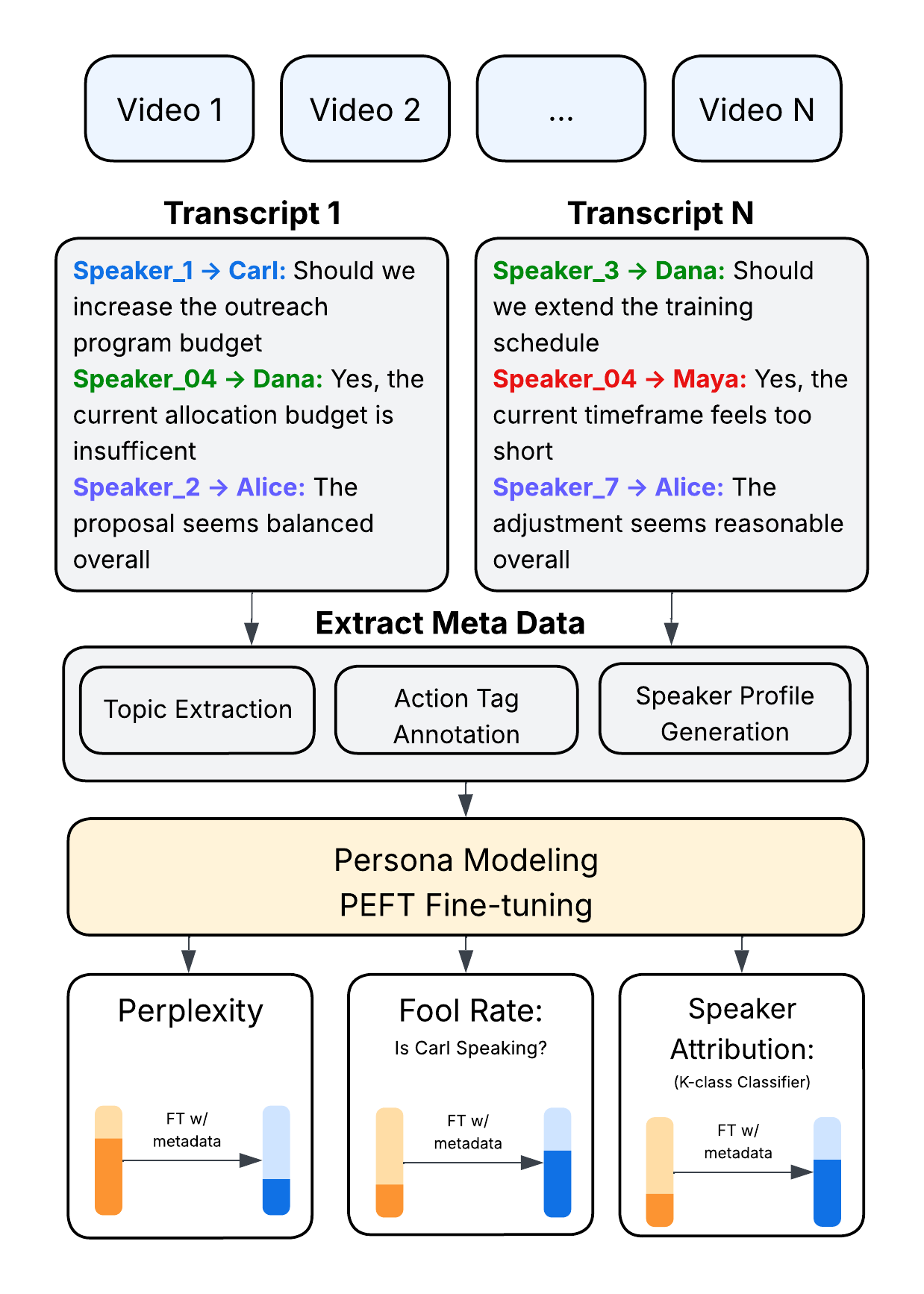 Large language models (LLMs) offer unprecedented opportunities to simulate multi-party deliberation in real-world settings, but realistic persona-aware modeling has been limited by the lack of speaker-attributed data and structured procedural information. This work presents a complete, reproducible pipeline for collecting, processing, and modeling multi-speaker deliberations. Publicly available Zoom recordings are transformed into speaker-attributed transcripts using multimodal diarization, and enriched with structured metadata including personas, agenda topics, and turn-level action tags. Parameter-efficient fine-tuning enables LLMs to generate dialogue that is both plausible and consistent with individual speaker styles. Evaluation across three newly released local government datasets—school board, municipal council, and appellate court meetings—demonstrates substantial reductions in perplexity, increased classifier-based fooling, and improved speaker-attribution accuracy. Human studies confirm that simulations are largely indistinguishable from real interactions, and temporal guidance enhances procedural coherence. The results provide a practical recipe for researchers to collect large-scale data, validate models, and run hyper-realistic simulations of real-world deliberative processes.